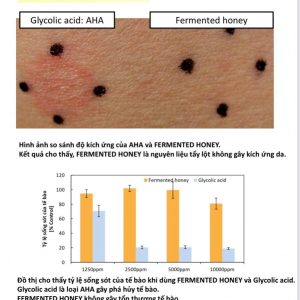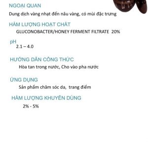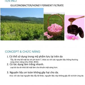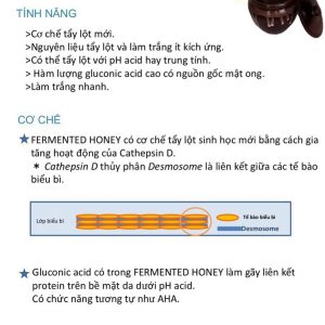 Chiết xuất mật ong hoa hồng lên men từ enzyme hoa đào giúp làm trắng , trị nám – Bong tróc tế bào sừng già cỗi giúp lỗ chân lông thông thoáng, ngừa mụn – Loại bỏ melanin đã hình thành trên da, giúp da trắng sáng hơn, giảm thâm do mụn – An toàn, không gây kích ứng da như AHA/BHA – Có hiệu quả ở cả pH acid và pH trung tính, khác với AHA/BHA chỉ hoạt động ở pH acid là pH dễ gây kích ứng da – dùng 1 -5%, tan nước tốt.